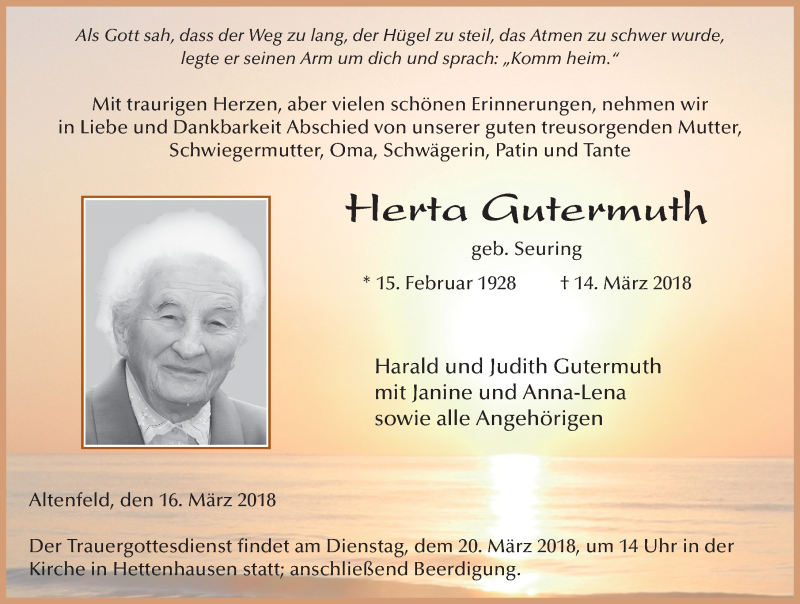 Hier finden Sie alle Traueranzeigen aus der Zeitung, die bisher für Herta Gutermuth erschienen sind. Weitere Traueranzeigen, die in der Zeitung erscheinen, werden hier ebenfalls aufgelistet