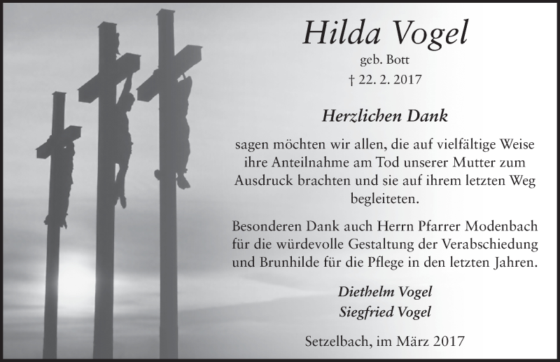 Hier finden Sie alle Traueranzeigen aus der Zeitung, die bisher für Hilda Vogel erschienen sind. Weitere Traueranzeigen, die in der Zeitung erscheinen, werden hier ebenfalls aufgelistet