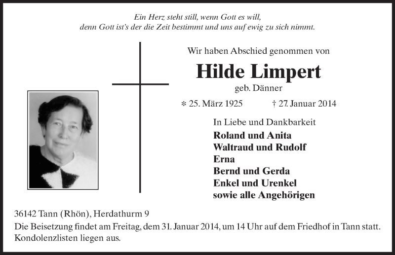 Hier finden Sie alle Traueranzeigen aus der Zeitung, die bisher für Hilde Limpert erschienen sind. Weitere Traueranzeigen, die in der Zeitung erscheinen, werden hier ebenfalls aufgelistet