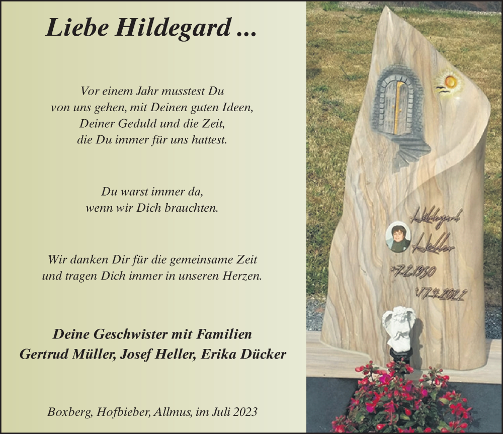 Hier finden Sie alle Traueranzeigen aus der Zeitung, die bisher für Hildegard Heller erschienen sind. Weitere Traueranzeigen, die in der Zeitung erscheinen, werden hier ebenfalls aufgelistet