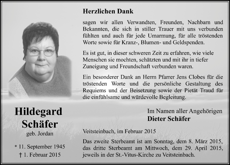 Hier finden Sie alle Traueranzeigen aus der Zeitung, die bisher für Hildegard Schäfer erschienen sind. Weitere Traueranzeigen, die in der Zeitung erscheinen, werden hier ebenfalls aufgelistet