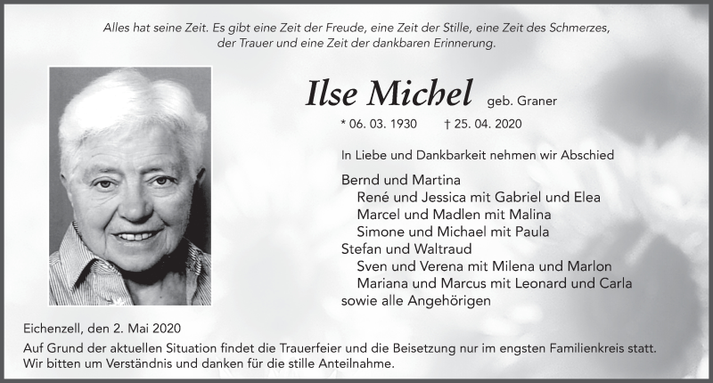 Hier finden Sie alle Traueranzeigen aus der Zeitung, die bisher für Ilse Michel erschienen sind. Weitere Traueranzeigen, die in der Zeitung erscheinen, werden hier ebenfalls aufgelistet