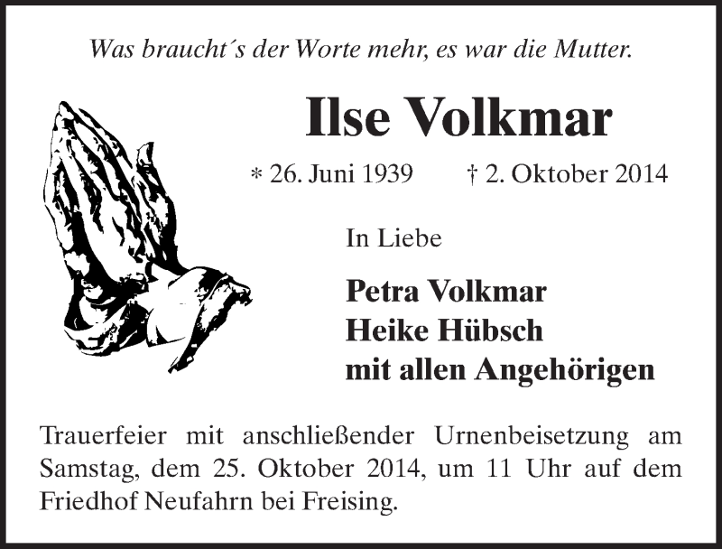 Hier finden Sie alle Traueranzeigen aus der Zeitung, die bisher für Ilse Volkmar erschienen sind. Weitere Traueranzeigen, die in der Zeitung erscheinen, werden hier ebenfalls aufgelistet