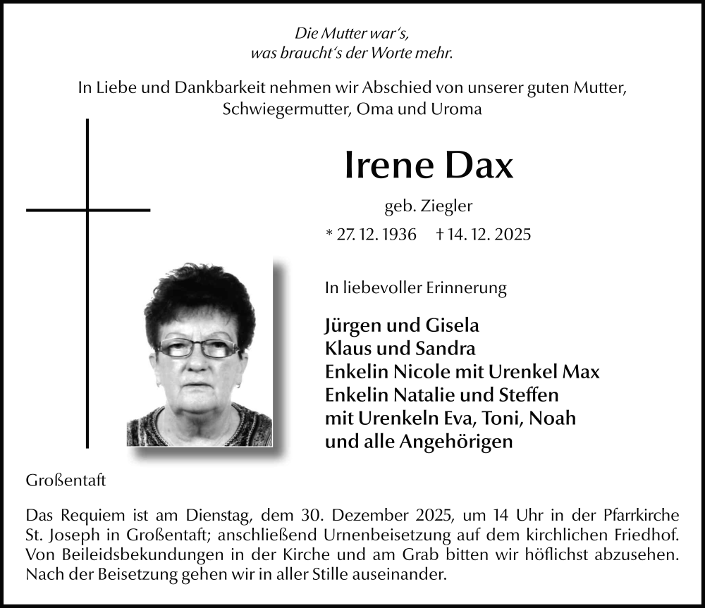 Hier finden Sie alle Traueranzeigen aus der Zeitung, die bisher für Irene Dax erschienen sind. Weitere Traueranzeigen, die in der Zeitung erscheinen, werden hier ebenfalls aufgelistet