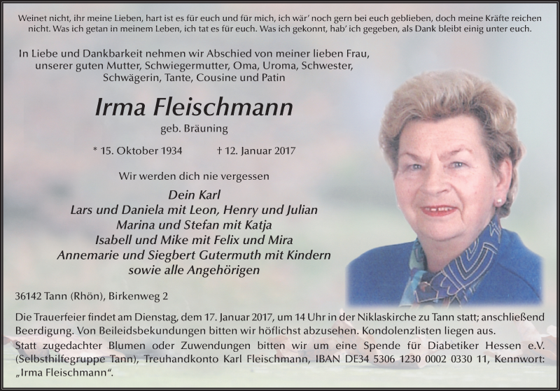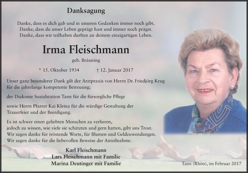 Hier finden Sie alle Traueranzeigen aus der Zeitung, die bisher für Irma Fleischmann erschienen sind. Weitere Traueranzeigen, die in der Zeitung erscheinen, werden hier ebenfalls aufgelistet