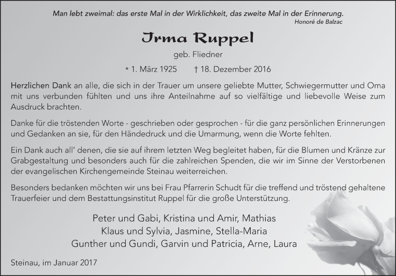 Hier finden Sie alle Traueranzeigen aus der Zeitung, die bisher für Irma Ruppel erschienen sind. Weitere Traueranzeigen, die in der Zeitung erscheinen, werden hier ebenfalls aufgelistet