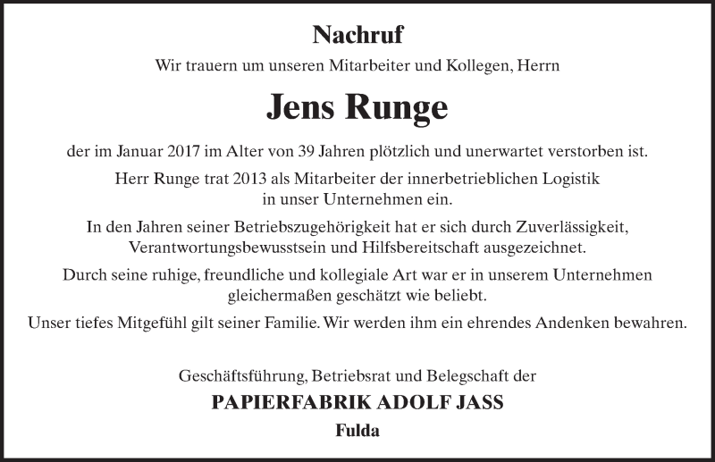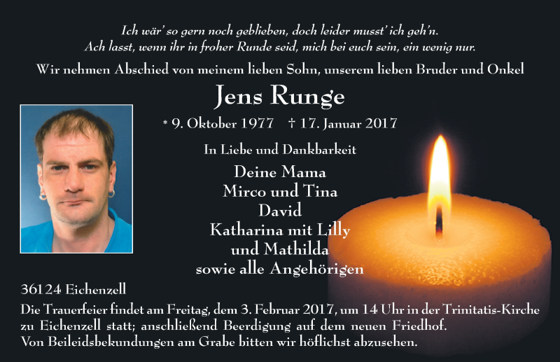 Hier finden Sie alle Traueranzeigen aus der Zeitung, die bisher für Jens Runge erschienen sind. Weitere Traueranzeigen, die in der Zeitung erscheinen, werden hier ebenfalls aufgelistet