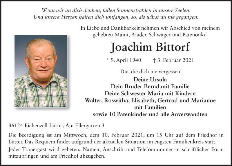 Hier finden Sie alle Traueranzeigen aus der Zeitung, die bisher für Joachim Bittdorf erschienen sind. Weitere Traueranzeigen, die in der Zeitung erscheinen, werden hier ebenfalls aufgelistet