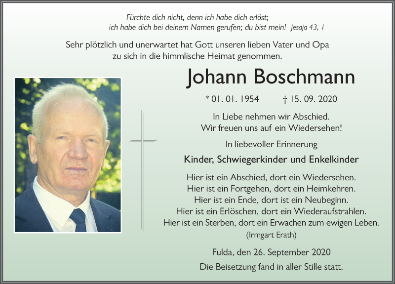 Hier finden Sie alle Traueranzeigen aus der Zeitung, die bisher für Johann Boschmann erschienen sind. Weitere Traueranzeigen, die in der Zeitung erscheinen, werden hier ebenfalls aufgelistet