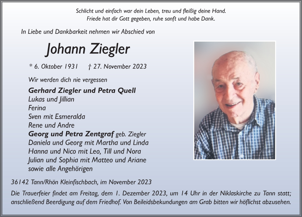 Hier finden Sie alle Traueranzeigen aus der Zeitung, die bisher für Johann Ziegler erschienen sind. Weitere Traueranzeigen, die in der Zeitung erscheinen, werden hier ebenfalls aufgelistet