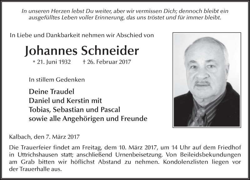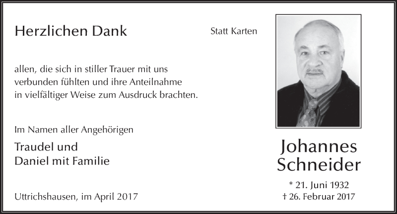 Hier finden Sie alle Traueranzeigen aus der Zeitung, die bisher für Johannes Schneider erschienen sind. Weitere Traueranzeigen, die in der Zeitung erscheinen, werden hier ebenfalls aufgelistet