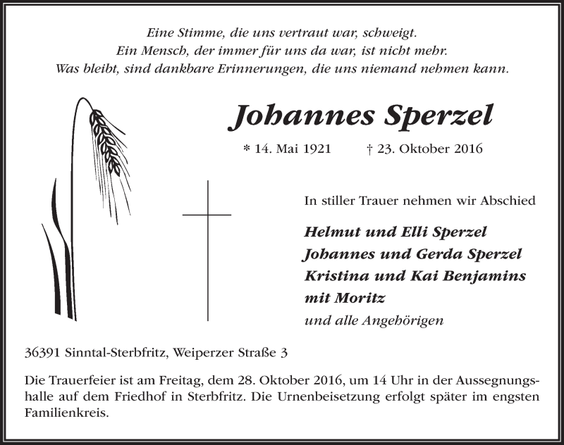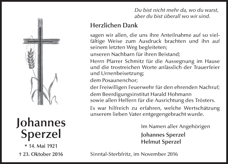 Hier finden Sie alle Traueranzeigen aus der Zeitung, die bisher für Johannes Sperzel erschienen sind. Weitere Traueranzeigen, die in der Zeitung erscheinen, werden hier ebenfalls aufgelistet