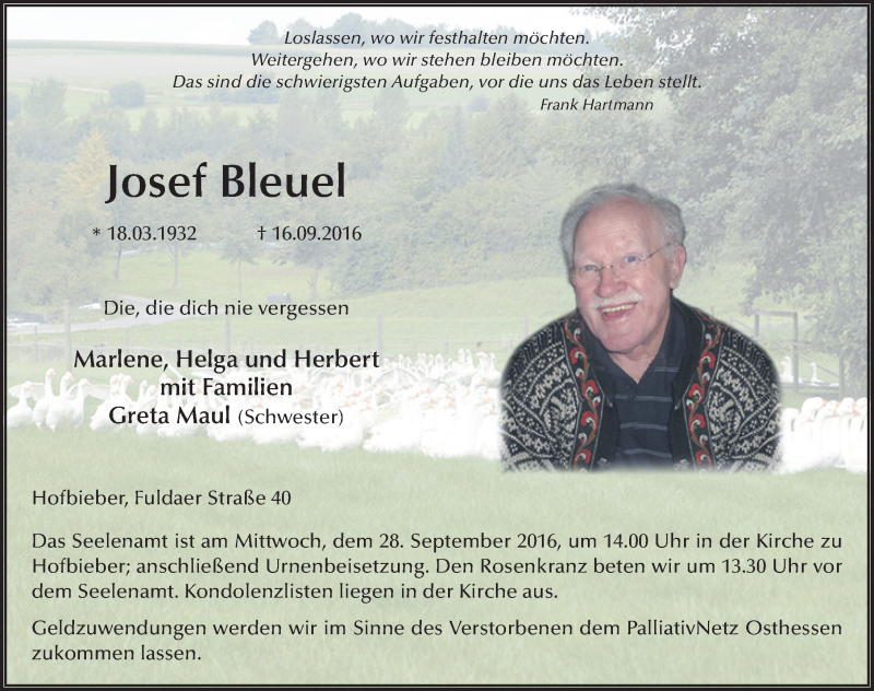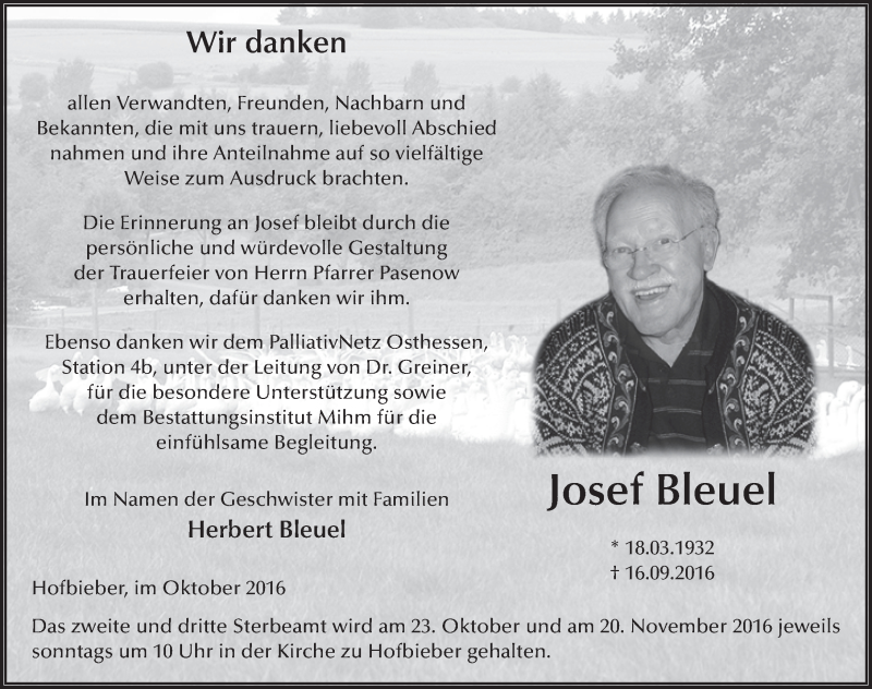 Hier finden Sie alle Traueranzeigen aus der Zeitung, die bisher für Josef Bleuel erschienen sind. Weitere Traueranzeigen, die in der Zeitung erscheinen, werden hier ebenfalls aufgelistet