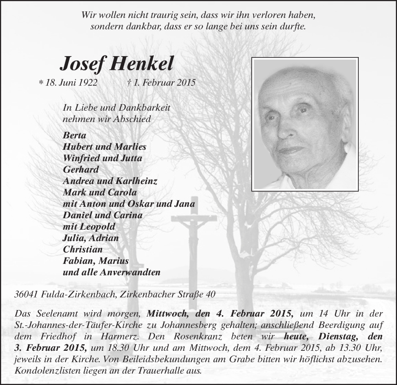 Hier finden Sie alle Traueranzeigen aus der Zeitung, die bisher für Josef Henkel erschienen sind. Weitere Traueranzeigen, die in der Zeitung erscheinen, werden hier ebenfalls aufgelistet
