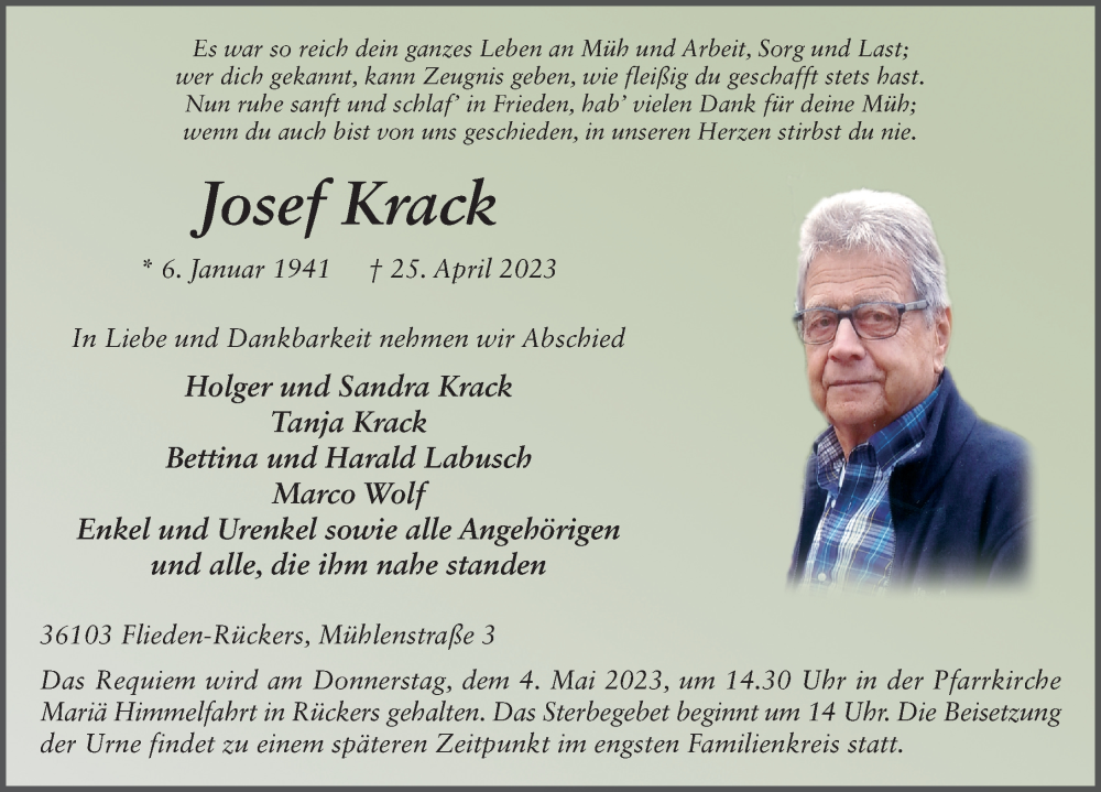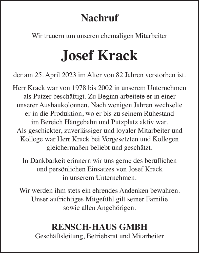 Hier finden Sie alle Traueranzeigen aus der Zeitung, die bisher für Josef Krack erschienen sind. Weitere Traueranzeigen, die in der Zeitung erscheinen, werden hier ebenfalls aufgelistet