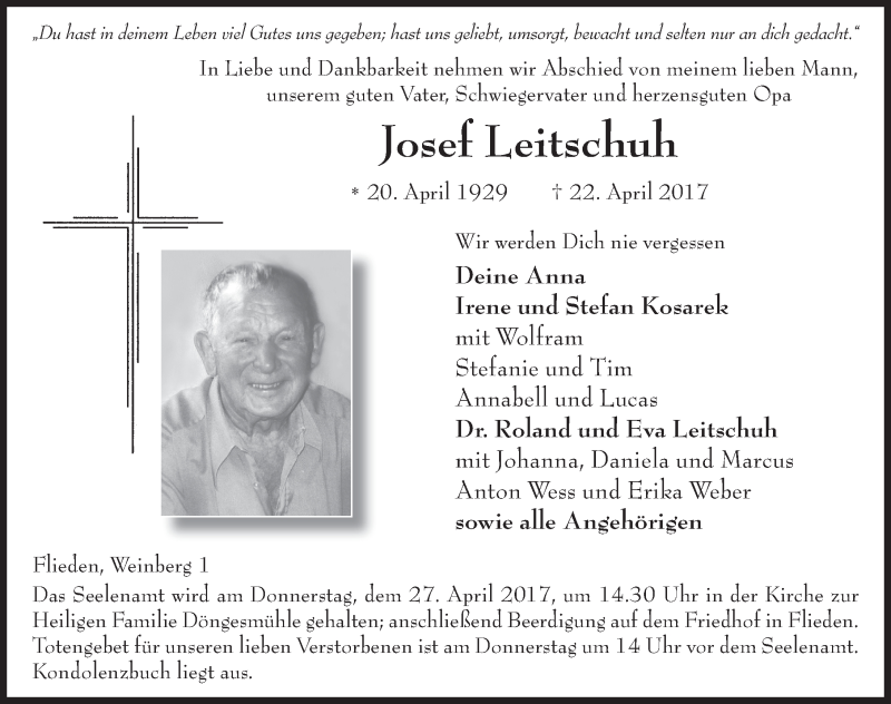 Hier finden Sie alle Traueranzeigen aus der Zeitung, die bisher für Josef Leitschuh erschienen sind. Weitere Traueranzeigen, die in der Zeitung erscheinen, werden hier ebenfalls aufgelistet
