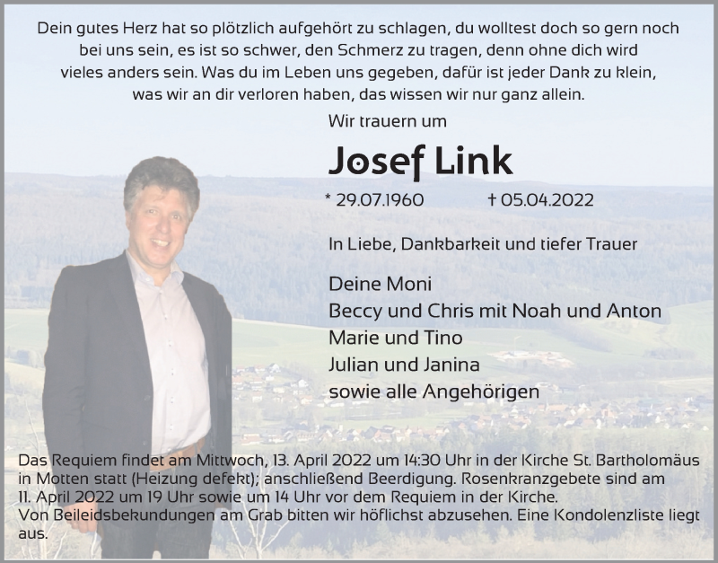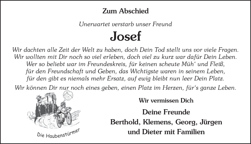 Hier finden Sie alle Traueranzeigen aus der Zeitung, die bisher für Josef Link erschienen sind. Weitere Traueranzeigen, die in der Zeitung erscheinen, werden hier ebenfalls aufgelistet