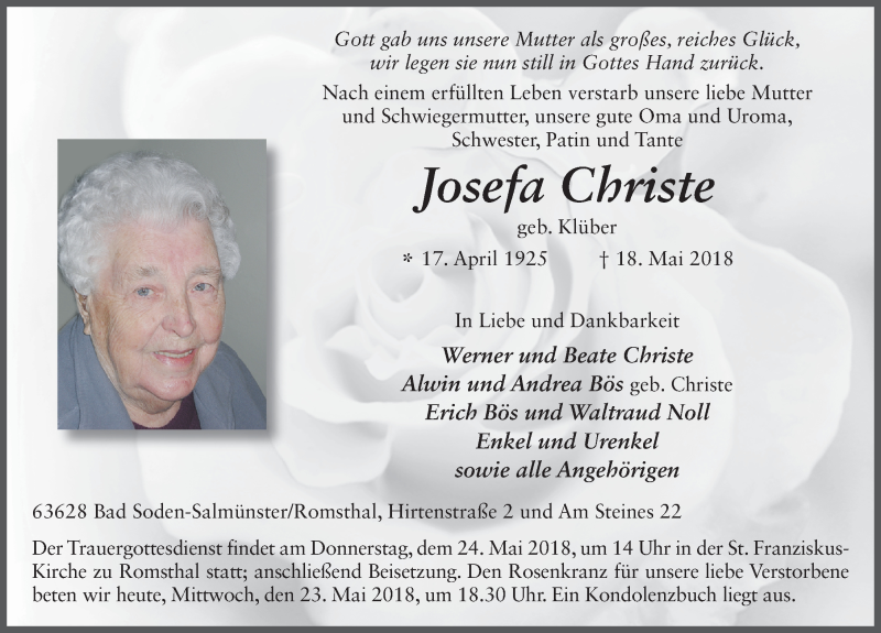 Hier finden Sie alle Traueranzeigen aus der Zeitung, die bisher für Josefa Christe erschienen sind. Weitere Traueranzeigen, die in der Zeitung erscheinen, werden hier ebenfalls aufgelistet