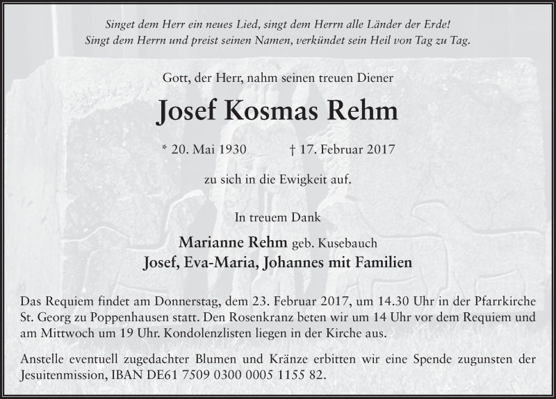 Hier finden Sie alle Traueranzeigen aus der Zeitung, die bisher für Josef Kosmas Rehm erschienen sind. Weitere Traueranzeigen, die in der Zeitung erscheinen, werden hier ebenfalls aufgelistet