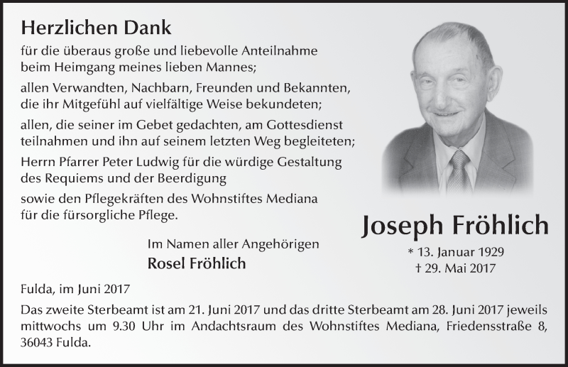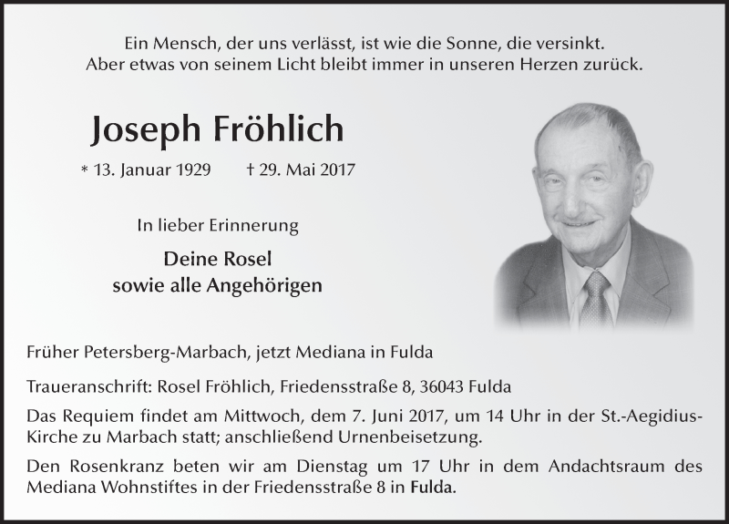 Hier finden Sie alle Traueranzeigen aus der Zeitung, die bisher für Joseph Fröhlich erschienen sind. Weitere Traueranzeigen, die in der Zeitung erscheinen, werden hier ebenfalls aufgelistet