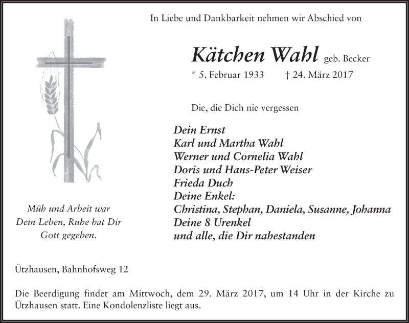 Hier finden Sie alle Traueranzeigen aus der Zeitung, die bisher für Kätchen Wahl erschienen sind. Weitere Traueranzeigen, die in der Zeitung erscheinen, werden hier ebenfalls aufgelistet