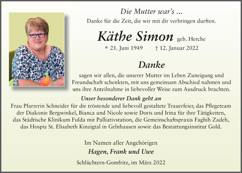 Hier finden Sie alle Traueranzeigen aus der Zeitung, die bisher für Käthe Simon erschienen sind. Weitere Traueranzeigen, die in der Zeitung erscheinen, werden hier ebenfalls aufgelistet