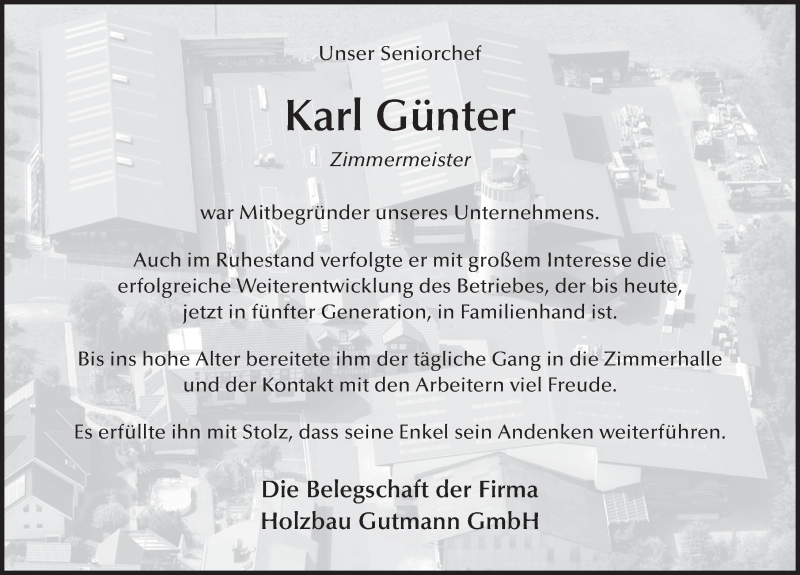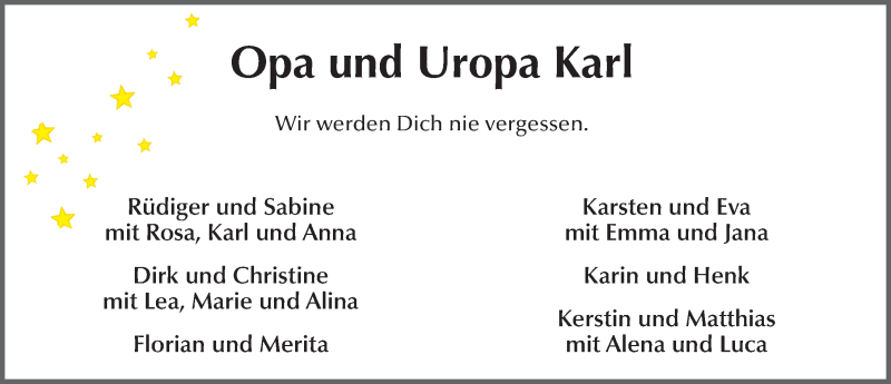 Hier finden Sie alle Traueranzeigen aus der Zeitung, die bisher für Karl Günter erschienen sind. Weitere Traueranzeigen, die in der Zeitung erscheinen, werden hier ebenfalls aufgelistet