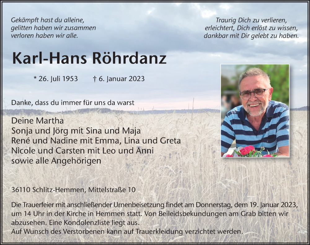 Hier finden Sie alle Traueranzeigen aus der Zeitung, die bisher für Karl Hans Röhrdanz erschienen sind. Weitere Traueranzeigen, die in der Zeitung erscheinen, werden hier ebenfalls aufgelistet
