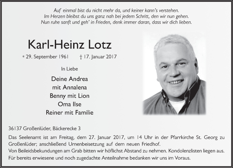 Hier finden Sie alle Traueranzeigen aus der Zeitung, die bisher für Karl-Heinz Lotz erschienen sind. Weitere Traueranzeigen, die in der Zeitung erscheinen, werden hier ebenfalls aufgelistet