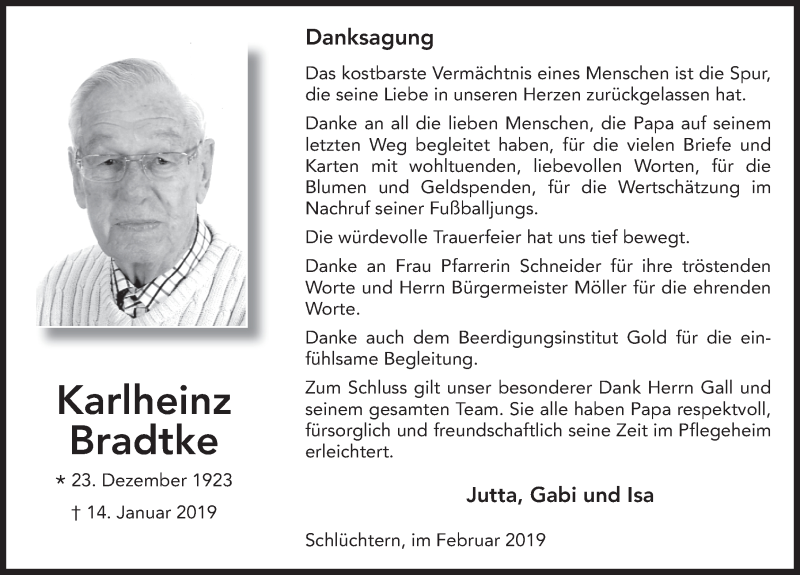 Hier finden Sie alle Traueranzeigen aus der Zeitung, die bisher für Karlheinz Bradtke erschienen sind. Weitere Traueranzeigen, die in der Zeitung erscheinen, werden hier ebenfalls aufgelistet