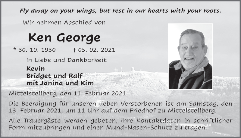 Hier finden Sie alle Traueranzeigen aus der Zeitung, die bisher für Ken George erschienen sind. Weitere Traueranzeigen, die in der Zeitung erscheinen, werden hier ebenfalls aufgelistet