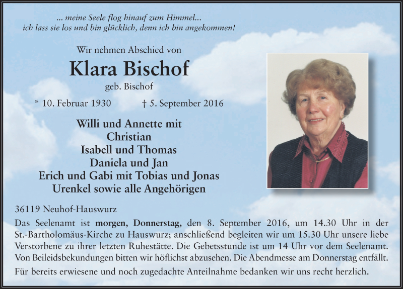 Hier finden Sie alle Traueranzeigen aus der Zeitung, die bisher für Klara Bischof erschienen sind. Weitere Traueranzeigen, die in der Zeitung erscheinen, werden hier ebenfalls aufgelistet