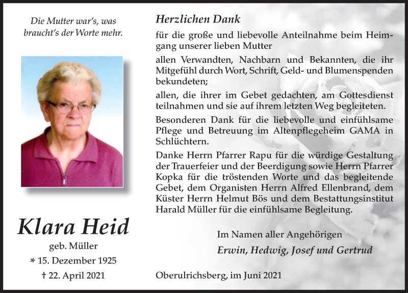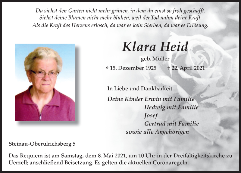 Hier finden Sie alle Traueranzeigen aus der Zeitung, die bisher für Klara Heid erschienen sind. Weitere Traueranzeigen, die in der Zeitung erscheinen, werden hier ebenfalls aufgelistet
