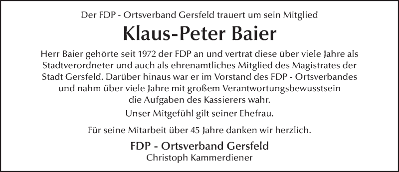 Hier finden Sie alle Traueranzeigen aus der Zeitung, die bisher für Klaus-Peter Baier erschienen sind. Weitere Traueranzeigen, die in der Zeitung erscheinen, werden hier ebenfalls aufgelistet