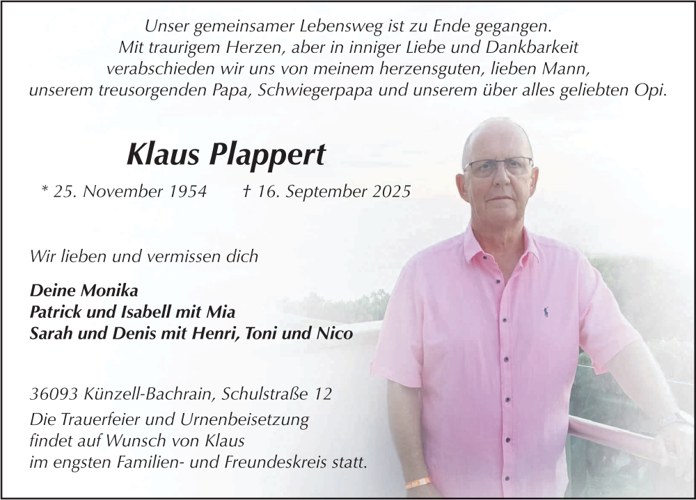 Hier finden Sie alle Traueranzeigen aus der Zeitung, die bisher für Klaus Plappert erschienen sind. Weitere Traueranzeigen, die in der Zeitung erscheinen, werden hier ebenfalls aufgelistet