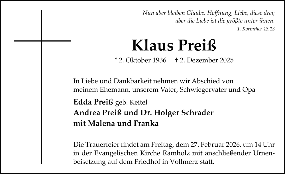 Hier finden Sie alle Traueranzeigen aus der Zeitung, die bisher für Klaus Preiß erschienen sind. Weitere Traueranzeigen, die in der Zeitung erscheinen, werden hier ebenfalls aufgelistet