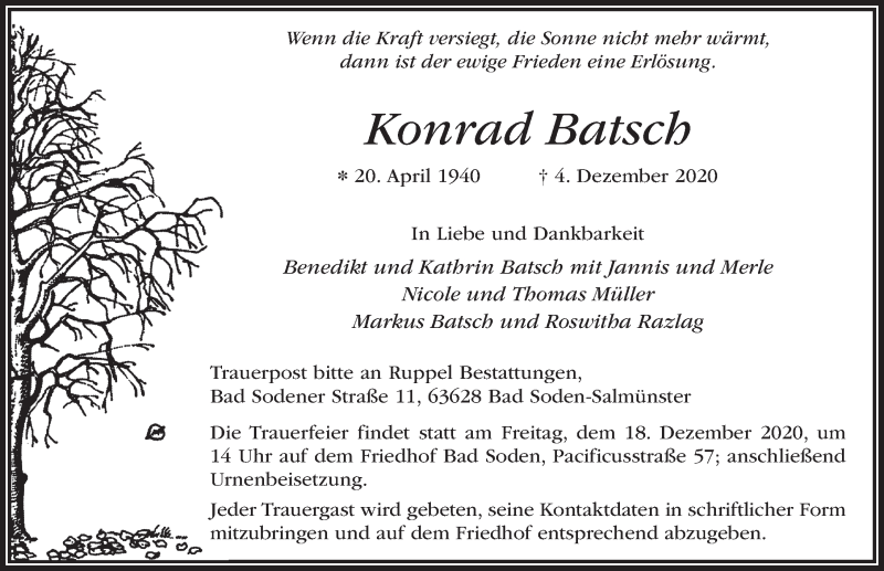 Hier finden Sie alle Traueranzeigen aus der Zeitung, die bisher für Konrad Batsch erschienen sind. Weitere Traueranzeigen, die in der Zeitung erscheinen, werden hier ebenfalls aufgelistet