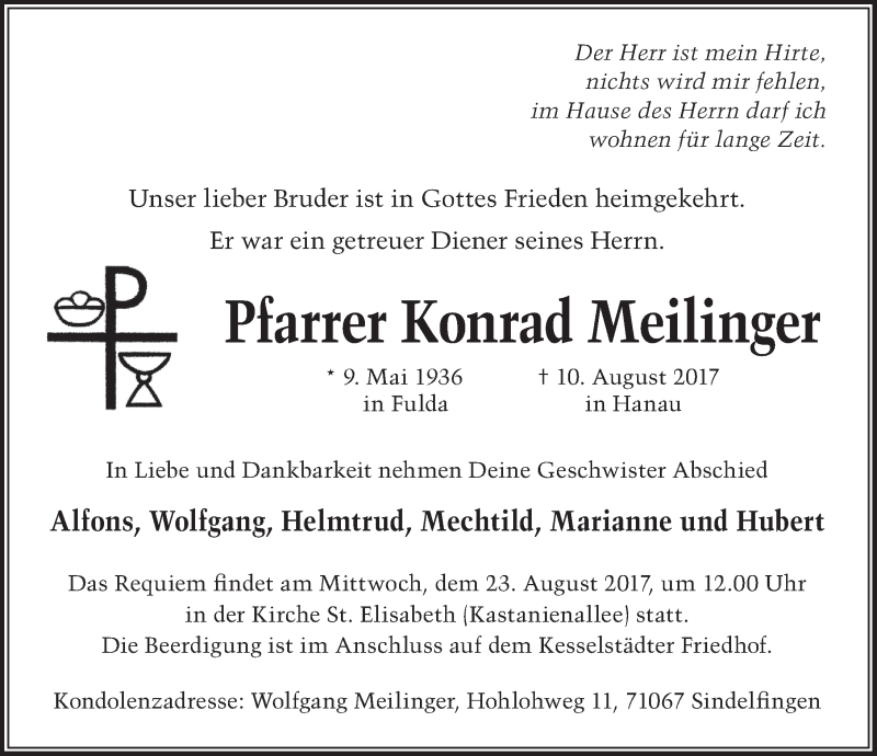 Hier finden Sie alle Traueranzeigen aus der Zeitung, die bisher für Konrad Meilinger erschienen sind. Weitere Traueranzeigen, die in der Zeitung erscheinen, werden hier ebenfalls aufgelistet