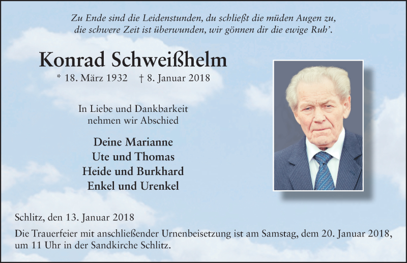 Hier finden Sie alle Traueranzeigen aus der Zeitung, die bisher für Konrad Schweißhelm erschienen sind. Weitere Traueranzeigen, die in der Zeitung erscheinen, werden hier ebenfalls aufgelistet