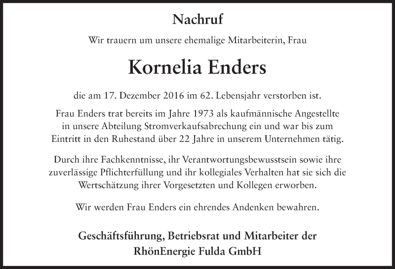 Hier finden Sie alle Traueranzeigen aus der Zeitung, die bisher für Kornelia Enders erschienen sind. Weitere Traueranzeigen, die in der Zeitung erscheinen, werden hier ebenfalls aufgelistet