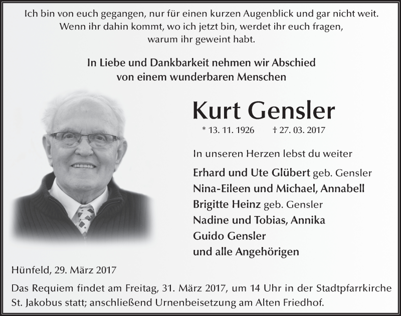 Hier finden Sie alle Traueranzeigen aus der Zeitung, die bisher für Kurt Gensler erschienen sind. Weitere Traueranzeigen, die in der Zeitung erscheinen, werden hier ebenfalls aufgelistet
