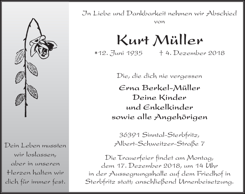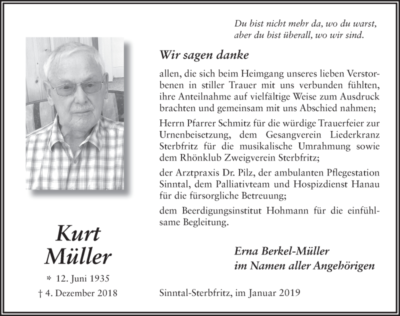Hier finden Sie alle Traueranzeigen aus der Zeitung, die bisher für Kurt Müller erschienen sind. Weitere Traueranzeigen, die in der Zeitung erscheinen, werden hier ebenfalls aufgelistet