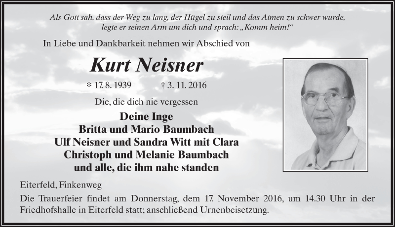 Hier finden Sie alle Traueranzeigen aus der Zeitung, die bisher für Kurt Neisner erschienen sind. Weitere Traueranzeigen, die in der Zeitung erscheinen, werden hier ebenfalls aufgelistet