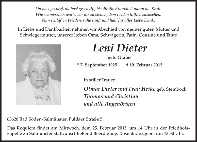 Hier finden Sie alle Traueranzeigen aus der Zeitung, die bisher für Leni Dieter erschienen sind. Weitere Traueranzeigen, die in der Zeitung erscheinen, werden hier ebenfalls aufgelistet