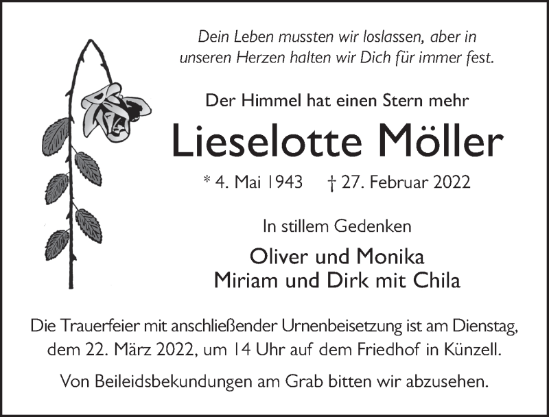 Hier finden Sie alle Traueranzeigen aus der Zeitung, die bisher für Lieselotte Möller erschienen sind. Weitere Traueranzeigen, die in der Zeitung erscheinen, werden hier ebenfalls aufgelistet