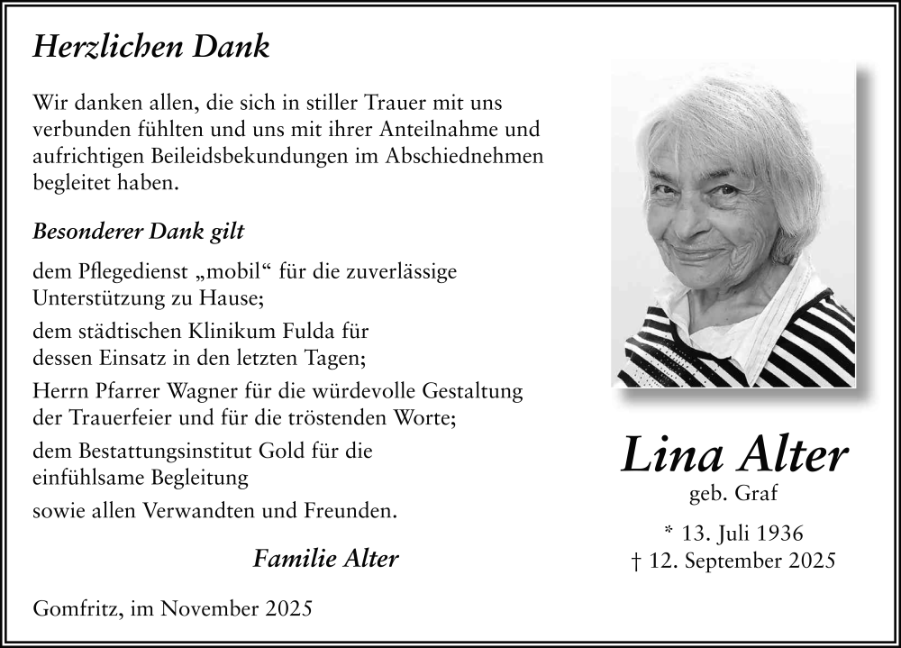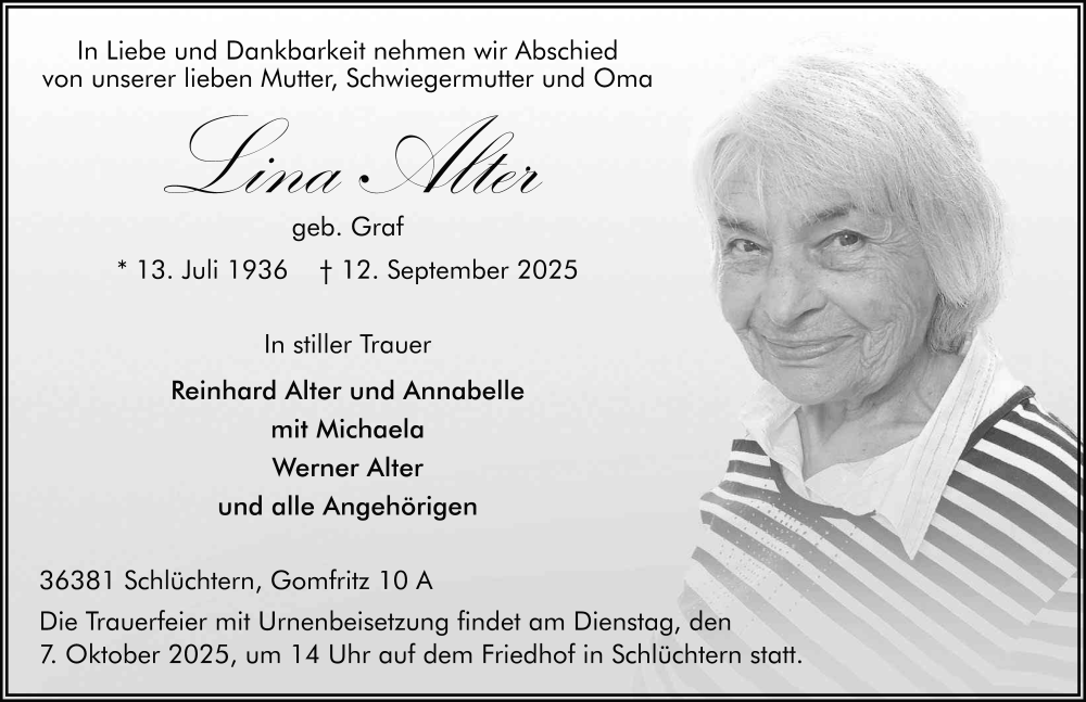 Hier finden Sie alle Traueranzeigen aus der Zeitung, die bisher für Lina Alter erschienen sind. Weitere Traueranzeigen, die in der Zeitung erscheinen, werden hier ebenfalls aufgelistet