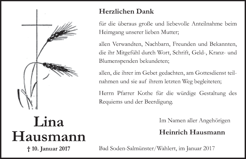 Hier finden Sie alle Traueranzeigen aus der Zeitung, die bisher für Lina Hausmann erschienen sind. Weitere Traueranzeigen, die in der Zeitung erscheinen, werden hier ebenfalls aufgelistet