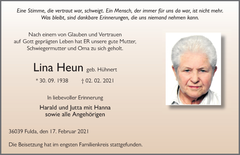 Hier finden Sie alle Traueranzeigen aus der Zeitung, die bisher für Lina Heun erschienen sind. Weitere Traueranzeigen, die in der Zeitung erscheinen, werden hier ebenfalls aufgelistet