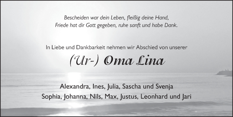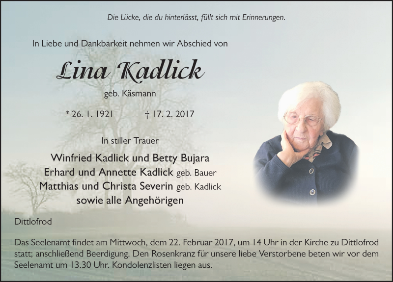 Hier finden Sie alle Traueranzeigen aus der Zeitung, die bisher für Lina Kadlick erschienen sind. Weitere Traueranzeigen, die in der Zeitung erscheinen, werden hier ebenfalls aufgelistet