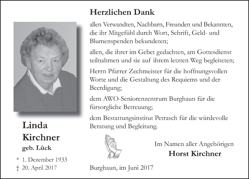 Hier finden Sie alle Traueranzeigen aus der Zeitung, die bisher für Linda Kirchner erschienen sind. Weitere Traueranzeigen, die in der Zeitung erscheinen, werden hier ebenfalls aufgelistet